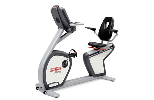 The first thing you notice about the Star Trac Pro Recumbent Bike is that it looks like two units. That's because Star Trac has taken out the middle section, making it much easier to mount the cycle. Most people choose recumbent cycles because they are easier to use, and the Star Trac Pro has taken this several steps further. Its sleek and aerodynamic design is complemented by a contoured seat built for comfort and lumbar support, plus easy position changes. Coming in silver and black with red trimming, the Star Trac Pro is built of corrosion-resistant aluminum, instead of steel, so it will never rust. The Star Trac Pro's armrests take the load off your shoulders, too, in addition to providing stress reduction for the back and knees that most recumbents feature. Further comfort improvements include an adjustable reading rack that slides toward the rider, putting less strain on the eyes, and a built-in personal fan, which keeps you cool as you ascend hills or just ride leisurely. In-line skating style toe-clips/straps also give you an extra level of security as you pedal. There are 11 programs to choose from on the Star Trac Pro, including two heart-rate and two watts controlled programs, along with an Astrand-Rhyming fitness test. On all programs, your heart-rate will be closely monitored (Dynamic Heart-Rate Control®) and the bike will adjust its intensity to keep you in your target zone. Entertainment options include FitLinxx® compatibility, external auxiliary port for Cardio Theater® and Broadcast Vision. This ergonomically focused recumbent also moves around your home or gym easily; it generates its own power so there are no cords, and comes with rolling casters so you can set it up wherever you want.